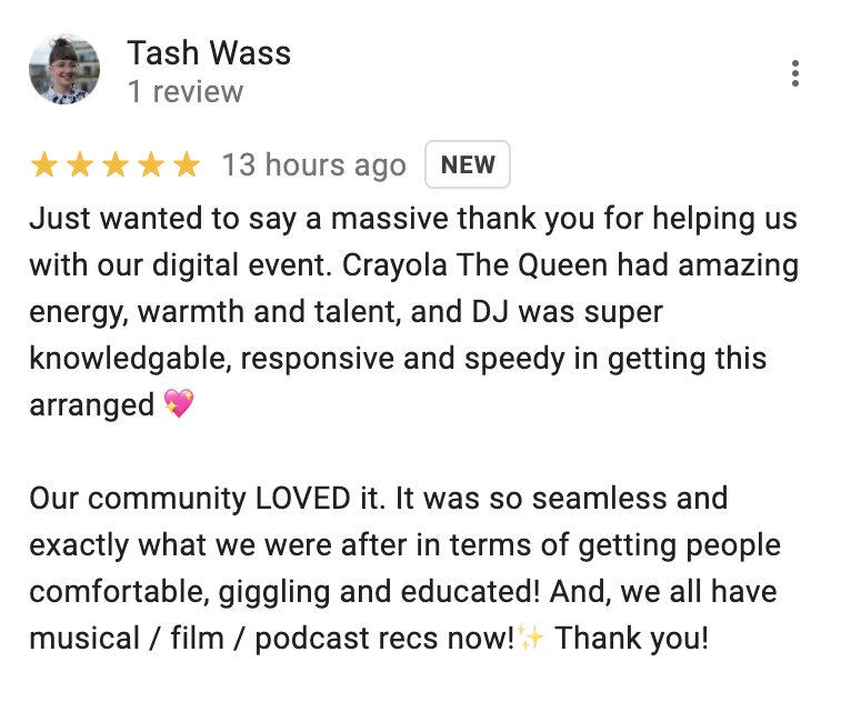 Gigi Zahir (formerly known as Crayola the Queen) is an international drag artist, singer, comedian and MC. Whether performing one of their naughty queer cabarets in London, keeping it profesh for corporate events online, or inspiring young and old with inclusive shows and educational workshops, they routinely bring a lot of heart and a lot of LOLs! Classically trained at The Stella Adler Studio of Acting in NYC, they’ve since found a home within musical comedy and the London cabaret scene. Recent theatre credits include The Wicked Witch in “Wicked Witches” (The Pleasance), Ria Listic in “Acid’s Reign” (Relish Theatre), Shona in “Frankie Goes To Bollywood” (UK Tour) and Cleopatra in “Cinderella” (Stratford East). Gigi has opened for Chappell Roan three times, and is named as the person who helped her realise she was a drag queen. As a teacher, Gigi has self-produced several rounds of their own drag courses, and has been a guest lecturer at the London College of Music since 2024.