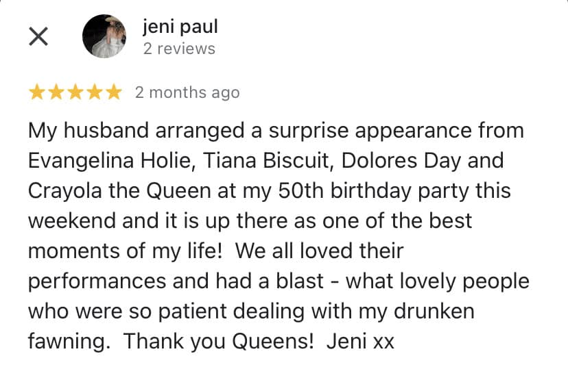 ComedyCompletely Customised ShowsDancingFamily FriendlyGames (Bingo Quizzes etc)Glamorous DragLipsynchingSinging